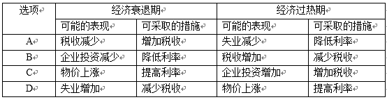 35.经济波动的不同阶段有不同表现,政府可采取的措施也有所不同。下表中正确的选项是( )