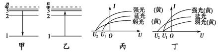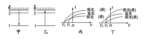 (1)(6分)图中甲、乙两幅图是氢原子的能级图,图中箭头表示出核外电子在两能级间跃迁的方向,________(填“甲”或“乙”)图中电子在跃迁时吸收光子;在光电效应实验中,有两个学生分别用蓝光和不同强度的黄光来研究光电流与电压的关系,得出的图象分别如丙、丁两幅图象所示、能正确表示光电流与电压关系的是________(填“丙”或“丁”)图.