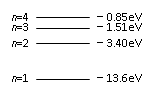 由于氢原子得基态能量为−13.6eV,跃迁时放出三种不同能量的光子,应在2激发态。最高能级的能量值为12.9−13.6= −1.51eV。