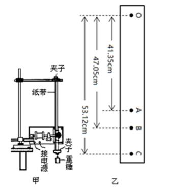 25.另选取一条符合实验要求的纸带,在第一个点上标O,在离O点较远的 位置开始选取三个连续点A、B、C,如图(乙)所示。已知打点计时器每隔0.02s打一次点,根据图上所得的数据,打B点时重锤的速度为_________m/s(保留三位有效数字),应取图中O点和________点来验证机械能守恒定律。