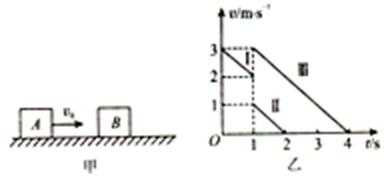 36. 【物理——选修3-5】如图甲所示,A、B两物体与水平面间的动摩擦因数相同,A的质量为3kg. A以一定的初速度向右滑动,与B发生碰撞,碰前A的速度变化如图乙中图线Ⅰ所示,碰后A、B的速度变化分别如图线Ⅱ、Ⅲ所示,g取10m/s2,求: