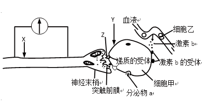 下图是人体生命活动部分调节示意图,甲~丙表示细胞,①~③表示过程,X~Z表示激素。激素X是一种糖蛋白,激素Y是一种氨基酸衍生物。