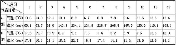 14.下表A、B两地终年盛行西风且纬度相当,分析两地的气候资料。