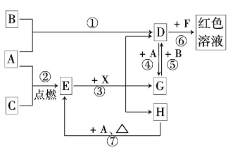 A、B、C为中学常见单质,其中一种为金属;通常情况下,A为固体,B为液体,C为气体。D、E、F、G、H、X、Y均为化合物,其中X是一种无氧强酸、E为黑色晶体,H在常温下为液体。它们之间的转化关系如图所示(其中某些反应条件和部分反应物已略去)。