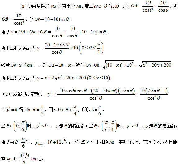 17.某地有三家工厂,分别位于矩形ABCD的顶点A、B及CD的中点P处,已知AB=20km,BC=10km,为了处理三家工厂的污水,现要在矩形ABCD的区域上(含边界),且A、B与等距离的一点O处建造一个污水处理厂,并铺设排污管道AO、BO、OP,设排污管道的总长为ykm。