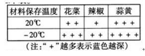 材料处理:称取新鲜的花菜、辣椒和蒜黄各2份,每份l0 g。剪碎后分成两组,一组置于20℃、另一组置于一20℃条件下保存24 h。