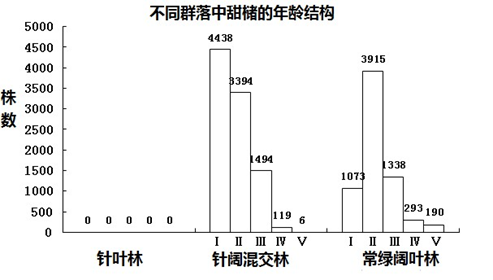 下图表示某山地针叶林群落向常绿阔叶林群落演替过程中马尾松利甜槠的年龄结构,I~V表示植株的年龄由小到大。相关叙述错误的是