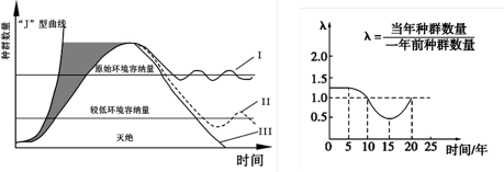 (1)左图中曲线 说明该种群的栖息地受到严重破坏。对人类的启示是:当某动物种群数量处于较低环境容纳量时,我们要建立____________,给它更广阔的生存空间,从而提高环境容纳量。