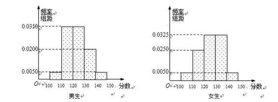 (1)从样本中分数小于110分的学生中随机抽取2人,求两人恰好为一男一女的概率;