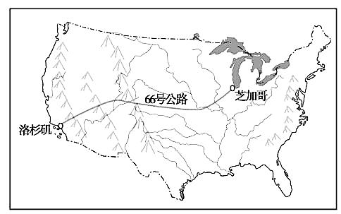 本题主要考查区域特征,意在考查考生获取和解读信息、调动和运用知识的能力。读图可知,66号公路穿越了商品谷物农业区;66号公路穿越美国东西部,地势起伏大,因此公路整体起伏大;66号公路联系了美国东北部工业区与西部港口,在二战期间运输量大增。