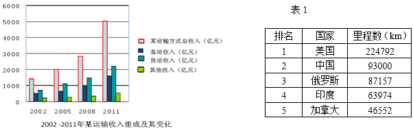 18.图为“2002-2011年我国某运输方式收入构成图”;表1为“2011年该运输方式里程长度居世界前五位的国家”。读图和表分析,与该运输方式营运里程相关度最高的是( )