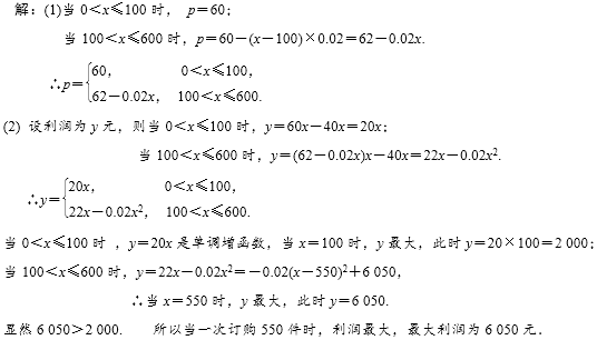 20.某服装厂生产一种服装,每件服装的成本为40元,出厂单价定为60元,该厂为鼓励销售商订购,决定当一次订购量超过100件时,每多订购一件,订购的全部服装的出场单价就降低0.02元,根据市场调查,销售商一次订购量不会超过600件.