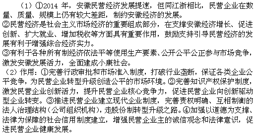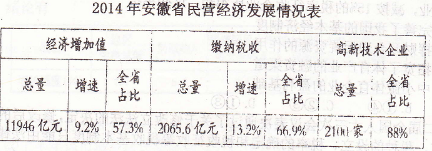 材料一 高三(1)班的同学们参观了我省一家著名高新科技民营企业,了解到安徽省十分重视民营经济的发展。2014年,安徽民营经济发展提速,活力进一步激发。