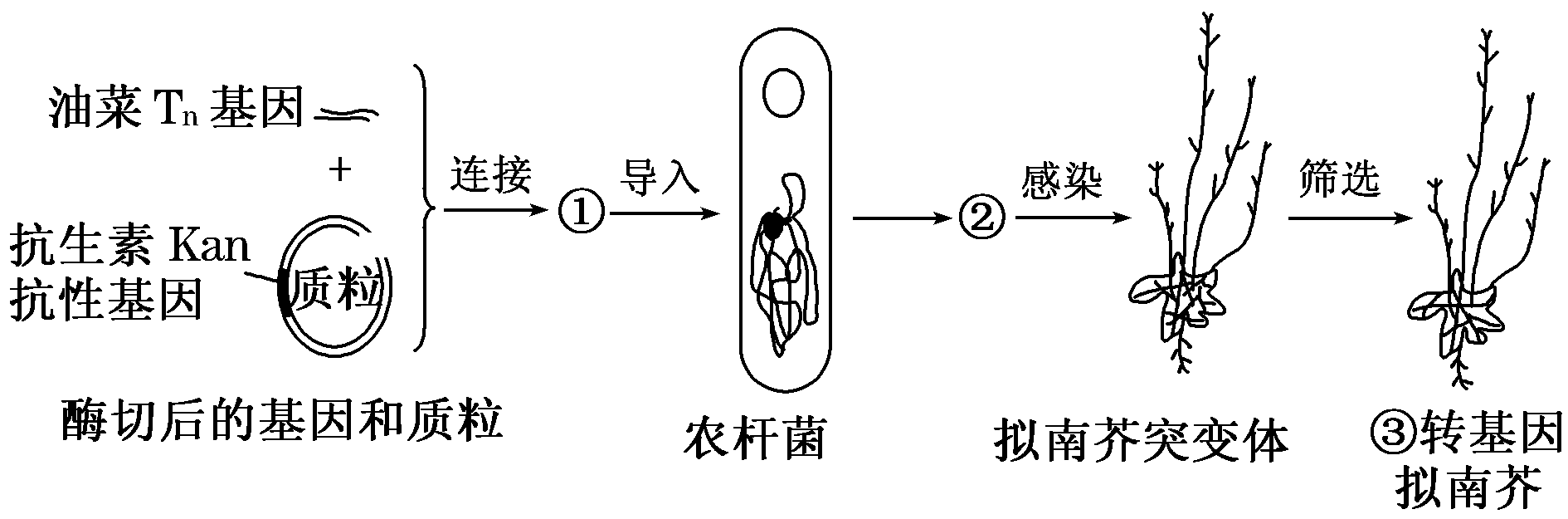 (2)图中①应为__________________。若②不能在含抗生素Kan的培养基上生长,则原因是________________。若③的种皮颜色为________,则说明油菜Tn基因与拟南芥T基因的功能相同。