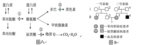 (4)上图B所示Ⅱ– 1因缺乏图A中的酶①而患有苯丙酮尿症,Ⅱ– 3因缺乏图A中的酶②而患有尿黑酸尿症,Ⅱ– 4不幸患血友病(上述三种性状的等位基因分别用Pp、Aa、Hh表示)。一号和二号家庭均不携带对方家庭出现的遗传病基因。Ⅰ– 3个体涉及上述三种性状的基因型是___________________。