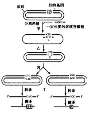(1)参照PCR技术,可用( )方法使质粒DNA双链解开,甲过程中加入的一定长度的核苷酸链,其中一个位置碱基C替代了碱基A,其它的序列与目的基因的一条链互补,该多核苷酸链在质粒DNA复制中作为( )。