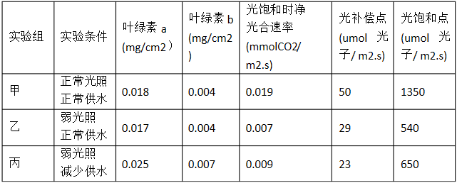 (注:光的补偿点是植物的光合强度和呼吸强度达到相等时的光照度值;光合作用不再随光照增强而加快时的光照强度,就是光合作用的光饱和点;乙、丙两组的弱光照均为15%的正常光照;丙组减少供水为50%的正常供水)