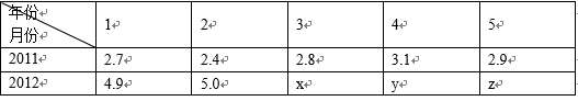 某校研究性学习小组,为了分析2012年某小国的宏观经济形势,查阅了有关材料,得到2011年和2012年1—5月该国CPI同比(即当年某月与前一年同月比)的增长数据(见下表),但2012年3,4,5三个月的数据(分别记为x,y,z)没有查到,有的同学清楚记得2012年1—5月的CPI数据成等差数列。