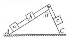 斜面ABC固定在水平面上,AB面光滑,BC面粗糙,AB长度是BC长度的两倍。三个相同木块a、b、c通过轻质光滑定滑轮用细线相连,细线平行于斜面,如图所示。用手按住c,使其静止在BC上;现撤去c所受手的作用力,则下列关于木块c的判断,正确的是