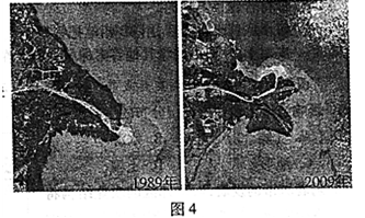 8. 图4为 我国北方某河流入海口1989年和2009年的卫星形象。该河口区河流主流曾于1996年人工改道。读图回答7~8题。