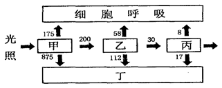 23. 下表是某生态系统营养和能量流动情况的调查结果,表中甲、乙、丙、丁分别代表不同的营养级,戊为分解者(单位:102KJ/m2/年)。对该生态系统营养关系叙述正确的是( )