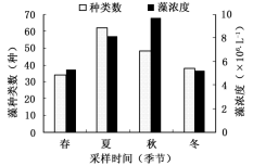 22.研究人员在不同季节对一小型湖泊水体进行采样,调查浮游藻类的数量和种类,结果如下图所示。 下列叙述符合生态学原理的是( )