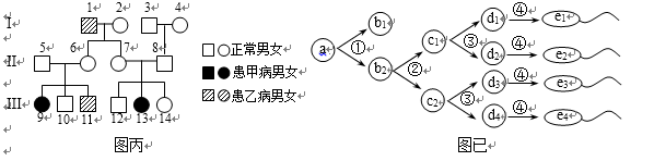 Ⅱ.图丙为某家族两种单基因遗传病的系谱图(这两种遗传病分别由位于常染色体上的基因A/a及X染色体上的基因B/b控制),图已表示5号个体生殖腺中某个细胞的连续分裂示意图。请回答: