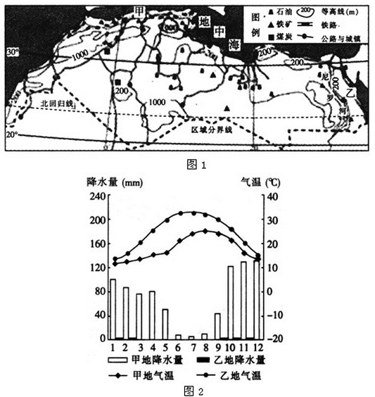 27.图1为北非简图,图2为甲乙两地气温和降水统计图。读图回答问题。