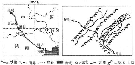 滇越铁路是中国目前使用时间最长的铁路,建于l903~1910年,全长854千米,工程艰巨浩大。读滇越铁路走向及某路段示意图,完成8~9题。
