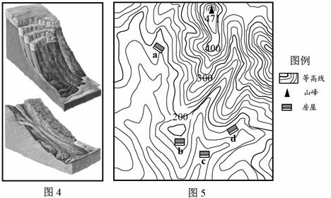 8. 图4为两种地质现象示意图,图5为华北某地区等高线地形图。结合图文材料分析,发生图4所示两种地质现象共同的必要条件是( )