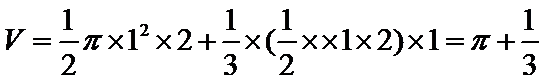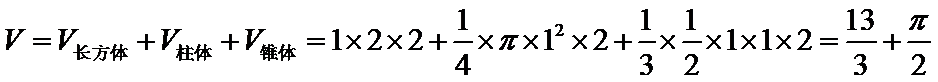 根据三视图还原几何体为一个长方体、三棱锥、四分之一圆柱构成(如图),由图中数据可算出该几何体的体积为: