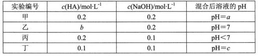 11. 常温下,将某一元酸HA和NaOH溶液等体积混合,两种溶液的浓度和混合后所得溶液 的pH如下表: