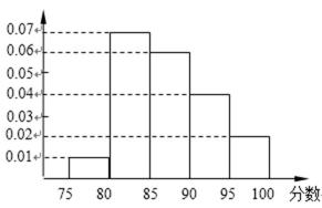某高校在2012年的自主招生考试成绩中随机抽取100名学生的笔试成绩,按成绩分组:第1组[75,80),第2组[80,85),第3组[85,90),第4组[90,95),第5组[95,100]得到的频率分布直方图如图所示。