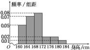 19.某市一次全市高中男生身高统计调查数据显示:全市100 000名男生的身高服从正态分布N(168,16).现从某学校高三年级男生中随机抽取50名测量身高,测量发现被测学生身高全部介于160 cm和184 cm之间,将测量结果按如下方式分成6组:第1组[160,164),第2组[164,168),…,第6组[180,184],如图是按上述分组方法得到的频率分布直方图.