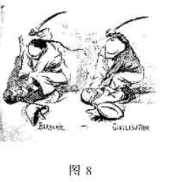 17.图8是一幅法国报刊上的政治讽刺漫画:义和团杀外国人为“野蛮:(BARBARIE);外国人杀义和团为“文明”(CIVILISATION)。这幅漫画的作者意在( )
