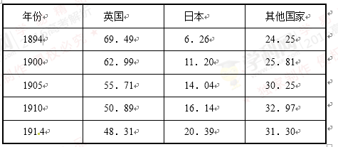 9.下表是1894—1914年英、日等国占中国对外贸易总值的百分比。[来源: