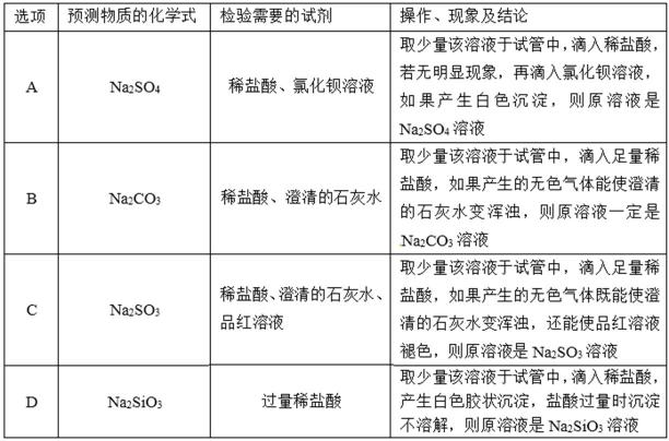C.取少量该溶液于试管中,滴入足量稀盐酸,如果产生的无色气体既能使澄清的石灰水变浑浊,还能使品红溶液褪色,则气体为二氧化硫,所以则原溶液是Na2SO3溶液,故C正确;