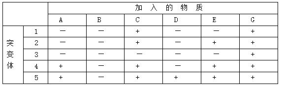 6.比特尔等在1941年提出了“一个基因一种酶假说”。在生物体内,各类物质或分子是经过一系列代谢步骤合成的,每一步都受特定的酶所催化。现假设已分离到某微生物的5种突变体(1-5),它们都不能合成生长所需的物质G,但是该微生物在合成途径中,物质A、B、C、D、E都是必需的,但不知它们的合成顺序;于是分析了这几种物质对各种突变体生长的影响。结果如下:(“+”表示加入相应物质,微生物能正常生长“-”表示加入相应物质,微生物不能生长)
