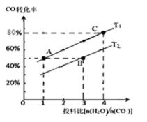 ②在某压强下,上述反应在不同温度、不同投料比时, CO的转化率如图所示。则KA、KB、KC三者之间 的大小关系为 T1温度下,将1molCO和4mol H2O (g)充入2L的密 闭容器中,5min后反应达到平衡状态,则0~5min 内的