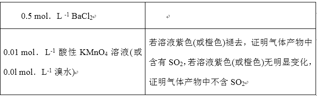 (2)根据FeSO4分解的气体产物可能为SO3,也可能是SO3和SO2的混合物,SO3遇到钡离子生成白色沉淀,所以用0.5 mol.L -1 BaCl2检验SO3;SO2能使高锰酸钾或溴水褪色,所以选用0.01 mol.L-1 酸性 KMnO4 溶液(或0.0l mol.L-1 溴水)检验SO2;若则溶液紫色(或橙色)褪去,证明气体产物中含有SO2,若溶液紫色(或橙色)无明显变化,证明气体产物中不含SO2;故答案如下: