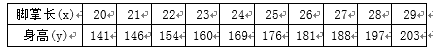 (1)在上表数据中,以“脚掌长”为横坐标,“身高”为纵坐标,作出散点图后,发现散点在一条直线附近,试求“身高”与“脚掌长”之间的线性回归方程