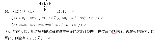26.学校化学研究小组对某溶液进行检测分析,该无色溶液中可能含有NH4+、K+、Al3+、HCO3—、Cl—、MnO4—、SO42—等离子中的几种离子。