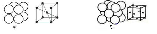 (4)小汽车的防撞气囊中叠氮化钠的工作原理是基于反应:6NaN3+ Fe2O3=3Na2O+2Fe+9N2;铁晶体有三种堆积方式,其中两种堆积方式分别如图甲、图乙所示(其晶胞特征如其右图所示):