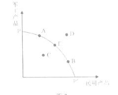 (2)在生产要素总量一定的前提下,若某个处于战争状态的国家生产处于E点(见图2),战争结束后,其产出组合最有可能由E点向___(A、B、C、D)方向移动。