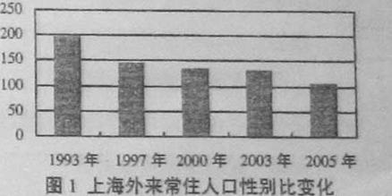 图1:上海外来人口性别比趋向平衡,这有利于社会、家庭、婚姻的稳定,有利于上海的经济社会健康发展(任答两点即可)。