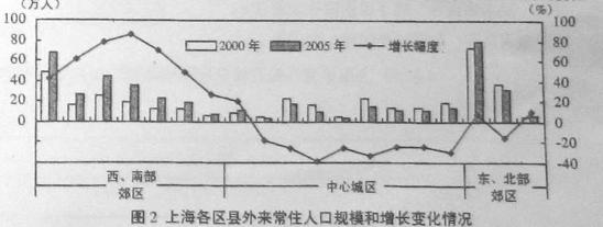 图2:从外来人口规模看,中心城区外来人口数量少于郊区;从外来人口增长幅度看,中心城区人口增长幅度远低于郊区人口增长幅度;郊区中西、南郊人口增长快于东、北郊区。这有利于上海中心城区的第二产业向郊区转移,有利于城市功能区的优化,有利于促进郊区的城市化进程,有利于减轻中心城区的环境压力