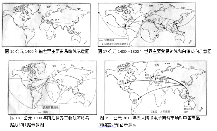 (2)阅读图16至图19,以世界洲际贸易的发展为视角,结合所学,对材料二所蕴含的历史信息进行解读。