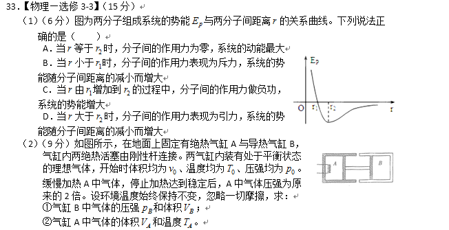 (2)(9分)如图所示,两端开口的气缸水平固定,A、B是两个厚度不计的活塞,面积分别为S1= 500px2,S2=250px2,它们之间用一根细杆连接,B通过水平细绳绕过光滑的定滑轮与质量为M的重物C连接,静止时气缸中的空气压强P1=1.2atm,温度T1=600K,气缸两部分的气柱长均为L.已知大气压强P0=latm=l×l05Pa,取g=10m/s2,缸内空气可看作理想气体,不计摩擦.求: