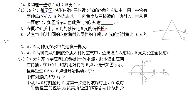 (2)如图所示,将一个折射率为n的透明长方体放在空气中,矩形ABCD是它的一个截面,一单色细光束入射到P点,入射角为求: