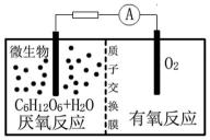 B.葡萄糖在微生物的作用下将化学能转化为电能,形成原电池,有电流产生,所以微生物促进了反应中电子的转移,故B正确;